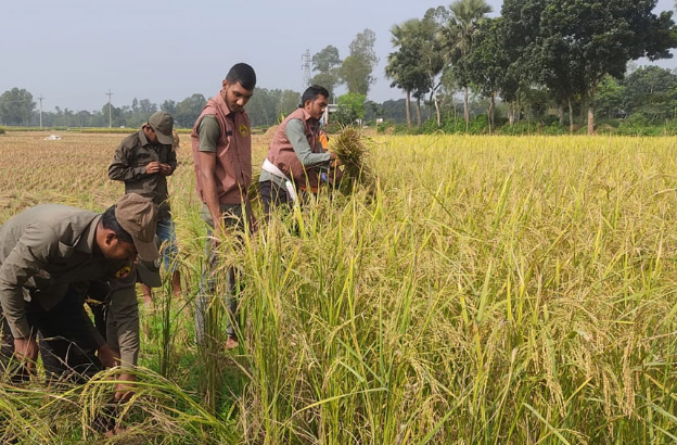 আনিছুল হক, রংপুরের তারাগঞ্জ উপজেলার হাড়িয়ারকুঠি ইউনিয়নের ২নং জুম্মাপাড়া গ্রামের একজন হতদরিদ্র অসহায় কৃষক। শ্রমিকের মজুরী বেশী হওয়ায় তার কষ্টার্জিত ১২ শতাংশ ফসলি জমির ধান কাটতে পারছিল না। এমন পরিস্থিতিতে পাকা ধান নিয়ে বিপাকে পড়ে গিয়ে ছিলেন এই হতদরিদ্র অসহায় কৃষক। হতদরিদ্র কৃষকের এই সমস্যার কথা চিন্তা করে তার পাশে দাড়িয়েছেন তারাগঞ্জ উপজেলার হাড়িয়ারকুঠি ইউনিয়ন আনসার ভিডিপির সদস্যরা। বৃহস্পতিবার সকালে উপজেলার হাড়িয়ারকুঠি ইউনিয়নের ২নং জুম্মা পাড়ার আনিসুল হকের ধান ক্ষেতে উপজেলা আনসার ভিডিপির কর্মকর্তাদের নির্দেশে হাড়িয়ারকুঠি ইউনিয়ন সহকারী আনসার ও ভিডিপি কমান্ডার নারায়ণ চন্দ্র রায়ের নেতৃত্বে ১৫-১৬ জন আনসার সদস্য দের নিয়ে এই ধান কেটে দেয়। এতে প্রশংসায় ভাসছেন হাড়িয়ারকুটি ইউনিয়নের আনসার ভিডিপি সদস্যরা। সুবিধাভোগী কৃষক আনিসুল হক জানান, শ্রমিকের মজুরি বেশি হওয়ায় আমি ফসলি পাকা ধান কাটতে পারছিলাম না। আনসার সদস্যরা স্বপ্রনোদিত হয়ে আমার এই ধান কেটে দিয়ে ঘর পর্যন্ত তুলে দেয়। এতে তারা আমার অনেক উপকার করে। আমিও আমার পরিবার বড়ই উপকৃত হই। হাড়িয়ারকুটি ইউনিয়ন সহকারী আনসার কমান্ডার নারায়ণ চন্দ্র রায় বলেন, উপজেলা আনসার ও গ্রাম প্রতিরক্ষা বাহিনীর স্যারদের নির্দেশনায় অসহায় কৃষকের ধান কেটে ঘর পর্যন্ত তুলে দিয়েছি। এতে আমার আনসার সদস্যরা আনন্দের সাথে কাজ করেছে। এলাকার দরিদ্র কৃষকটি উপকৃত হয়েছে। এই মহতি কাজটি চলমান থাকবে। যদি আরো কারো অর্থাভাবে ধান কাটা লাগে তারা আমাদের বললে আমরা তা করে দেবো।