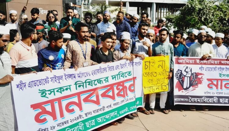 হিন্দুত্ববাদী সন্ত্রাসী সংগঠন ইসকন বন্ধের দাবিতে রাজধানির যাত্রাবাড়িতে সমাবেশ ও বিক্ষোভ মিছিল করেছে বৈষম্যবিরোধী ছাত্র জনতা। সমাবেশে বক্তারা বলেন, ইসকন নেতা চিন্ময় ও তার অনুসারিরা সারাদেশে সন্ত্রাসী কার্যক্রম চালাচ্ছে।