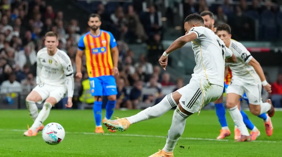 একদিন আগেই প্রথমবার ইউরোপিয়ান গোল্ডেন বুট জিতলেন রিয়াল মাদ্রিদের ফরাসি তারকা কিলিয়ান এমবাপে। গত মৌসুমে লা লিগার ৩৪ ম্যাচে ৩১ গোল তাকে এই পুরস্কার এনে দেয়। পরদিন মাঠে নেমেই জোড়া গোল করলেন এমবাপে। পাশাপাশি জুড বেলিংহ্যাম ও আলভারো কারেরাসের গোলে ভ্যালেন্সিয়াকে ৪-০ ব্যবধানে হারিয়েছে রিয়াল। অবশ্য ভিনিসিয়ুস জুনিয়র পেনাল্টি মিস না করলে ব্যবধান আরও বাড়ত। ঘরের মাঠ সান্তিয়াগো বার্নাব্যুতে গত শনিবার রাতে জাবি আলোনসোর দল একপেশে দাপটই দেখিয়েছে। ৬৬ শতাংশ পজেশনের পাশাপাশি ১৯ শট নিয়ে ১০টিই লক্ষ্যে রাখতে পারে স্বাগতিকরা। বিপরীতে স্রেফ ৩ শটের মধ্যে দুটি লক্ষ্যে ছিল ভ্যালেন্সিয়ার। এই জয়ে লস ব্লাঙ্কোসরা লা লিগার শীর্ষস্থান আরও সংহত করলো। ১১ ম্যাচে তাদের পয়েন্ট ৩০। সমান ম্যাচে ২৩ পয়েন্ট নিয়ে ভিয়ারিয়াল দুই এবং একটি কম খেলে ২২ পয়েন্ট পাওয়া বার্সেলোনা তিনে রয়েছে। প্রতিপক্ষের রক্ষণকে তটস্থ রেখে ম্যাচের ১৯ মিনিটে লিড নেয় রিয়াল। প্রতিপক্ষ ডিফেন্ডারের হ্যান্ডবলের সুবাদে তারা পেনাল্টি পায়। এল ক্লাসিকোয় পেনাল্টি মিস করা এমবাপে স্পট কিকে গোল করলেন এবার। যা লা লিগায় তার টানা আট ম্যাচেই গোল। ৩১ মিনিটে তিনি দ্বিতীয় গোলও পেয়ে যান। আর্দা গুলারের ক্রসে বল পেয়ে ভলিতে গোলটি করেন এমবাপে। গোল্ডেন বুট জেতা এই ফরাসি অধিনায়ক এবারও এখন পর্যন্ত লা লিগার সর্বোচ্চ গোলদাতা। ১১ ম্যাচে তিনি গোল ১৩তম গোল করলেন। বিরতির আগে ৪৪ মিনিটে রিয়ালের পক্ষে ব্যবধান আরও বাড়ালেন বেলিংহ্যাম। টানা তৃতীয় ম্যাচে তিনি গোল করলেন। ফেদরিকো ভালভার্দের পাস ধরে এই ইংলিশ মিডফিল্ডার ডি-বক্সের বাইরে একজনের চ্যালেঞ্জ সামলে জোরালো শটে বল জালে জড়ান। চোট কাটিয়ে ফেরার পর পুরোদমে ছন্দ ফিরলেন এল ক্লাসিকো জয়ের অন্যতম নায়ক বেলিংহ্যাম। অবশ্য তার মিনিট তিনেক আগে ভিনিসিয়ুস পেনাল্টি মিস করেছেন। কারেরাস প্রতিপক্ষের ডি বক্সে ফাউলের শিকার হলে ভিনির নেওয়া শট ঠেকান ভ্যালেন্সিয়া গোলরক্ষক। এদিন মৌসুমে প্রথমবার এন্ড্রিক ফিলিপেকে বদলি হিসেবে মাঠে নামান আলোনসো। এরপর রিয়ালের খেলার ধারায়ও হালকা পরিবর্তন আসে। ৮২ মিনিটে রদ্রিগোর একটি প্রচেষ্টা রক্ষণে পরাস্ত হলেও স্প্যানিশ ডিফেন্ডার কারেরাস আচমকা শটে স্কোরশিটে নাম তোলেন। ৪-০ ব্যবধানে বড় জয় নিশ্চিত করে রিয়াল।