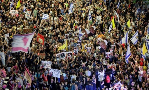গাজায় যুদ্ধ বন্ধের দাবিতে গত শনিবার তেল আবিবে হাজার হাজার মানুষ বিক্ষোভ করেছে। এর আগের দিনই গাজায় যুদ্ধ সম্প্রসারণে ইসরাইল সরকার গাজা দখলের ঘোষণা দিয়েছে। এসময় বিক্ষোভকারীরা বিভিন্ন প্ল্যাকার্ড হাতে নিয়ে দাঁড়িয়েছিলেন এবং ফিলিস্তিনে জিম্মি থাকা ইসরাইলিদের ছবি তুলে ধরে সরকারের কাছে তাদের মুক্তির দাবি জানান। এই বিক্ষোভে অংশগ্রহণকারীর সংখ্যা কয়েক হাজার বলে অনুমান করেন স্থানীয়রা। তবে জিম্মিদের পরিবারের প্রতিনিধিত্বকারী একটি দল জানায়, এতে প্রায় ১ লাখ মানুষ অংশ নিয়েছিল। তবে সরকার জনসমাগমে উপস্থিতির সংখ্যা নিয়ে কোনো আনুষ্ঠানিক তথ্য দেয়নি। তবে সাম্প্রতিক সময়ে অনুষ্ঠিত অন্যান্য যুদ্ধবিরোধী সমাবেশগুলোর চেয়ে এটি অনেক বড় ছিল। নিহত এক জিম্মির আত্মীয় শাহার মোর জাহিরো এএফপি’কে বলেন, ‘প্রধানমন্ত্রী বেনিয়ামিন নেতানিয়াহুর প্রতি আমরা সরাসরি একটি বার্তা দিতে চাই। তা হলো গাজার কোনো অংশ দখল করার কারণে জিম্মিরা যদি খুন হয় তবে আমরা আপনাকে ছাড়ব না। আমরা শহরের মোড়ে, নির্বাচনী প্রচারণায়, সব জায়গায় আপনার পিছু নেব। ’ শুক্রবার নেতানিয়াহুর নিরাপত্তা মন্ত্রিসভা গাজা শহর দখলের জন্য একটি বড় ধরনের অভিযানের পরিকল্পনা অনুমোদন করে। যা দেশে বিদেশে সমালোচনার ঝড় তোলে। ইসরাইলের মিত্র কিছু আন্তর্জাতিক শক্তি জিম্মিদের ফিরিয়ে আনতে এবং গাজায় মানবিক সংকট নিরসন করতে একটি সমঝোতামূলক যুদ্ধবিরতির জন্য নেতানিয়াহুকে চাপ দিচ্ছে। এতো সমালোচনা এবং ইসরাইলি সামরিক বাহিনীর শীর্ষ কর্মকর্তাদের মধ্যে মতবিরোধের গুঞ্জন সত্ত্বেও নেতানিয়াহু তার সিদ্ধান্তে অটল রয়েছেন। শুক্রবার রাতে সামাজিক যোগাযোগ মাধ্যমে এক পোস্টে নেতানিয়াহু বলেন, আমরা গাজা দখল করতে যাচ্ছি না, আমরা হামাসের কাছ থেকে গাজাকে মুক্ত করতে যাচ্ছি। গত ২২ মাস ধরে চলমান এই যুদ্ধের সময়ে প্রধানমন্ত্রী নেতানিয়াহু নিয়মিত বিক্ষোভের মুখে পড়েছেন। অনেক সমাবেশে সরকার ও হামাসের মধ্যে একটি চুক্তি করার দাবি জানানো হয়। যেমনটা অতীতে জিম্মিদের বিনিময়ে ইসরাইলের কারাগারে থাকা ফিলিস্তিনি বন্দিদের মুক্তি দেওয়া হয়েছিল। ২০২৩ সালে হামাস আক্রমণ চালিয়ে ২৫১ জন ইসরাইলিকে জিম্মি করে, যাদের মধ্যে ৪৯ জন এখনও গাজায় আটক আছেন। সামরিক বাহিনীর মতে, এদের মধ্যে ২৭ জন মারা গেছেন। এদিকে গত শনিবার ফিলিস্তিনি কর্তৃপক্ষ গাজায় ইসরাইলিদের অভিযান সম্প্রসারণের পরিকল্পনাকে নিন্দা জানিয়েছে। ফিলিস্তিনি সরকারি সংবাদ সংস্থা ওয়াফা’য় প্রকাশিত এক বিবৃতি অনুযায়ী, ফিলিস্তিন প্রেসিডেন্ট মাহমুদ আব্বাস বলেন, এই পরিকল্পনা একটি ‘নতুন অপরাধ’ এবং এটি অবিলম্বে বন্ধ করার জন্য জরুরি পদক্ষেপ নেওয়া প্রয়োজন। ’ ত