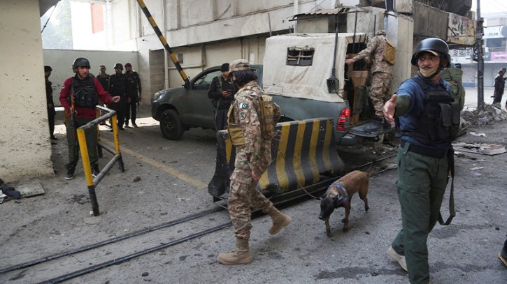 পাকিস্তানের পেশোয়ারে ফেডারেল কনস্টেবুলারির (এফসি) সদর দপ্তরে আত্মঘাতী হামলার চেষ্টা হলে নিরাপত্তা বাহিনীর পাল্টা আক্রমণে কমপক্ষে তিনজন সন্ত্রাসী নিহত হয়েছে। এ সময় এফসির তিন সদস্য প্রাণ হারিয়েছেন। খবর জিও নিউজের। গতকাল সোমবার কর্মকর্তারা এ কথা জানিয়েছেন। পেশোয়ার ক্যাপিটাল সিটি পুলিশের কর্মকর্তা ড. মিয়া সাঈদ বলেন, তিনজন আত্মঘাতী বোমা হামলাকারী কনস্টেবল সদর দপ্তরে প্রবেশের চেষ্টা করেছিল। একজন হামলাকারী এফসি সদর দপ্তরের প্রধান ফটকে বিস্ফোরণ ঘটায় এবং বাকি দুজন সদর দপ্তরের প্রাঙ্গণে প্রবেশ করতে সক্ষম হয়। ড. মিয়া সাঈদ আরও বলেন, এফসির সদস্যরা তাৎক্ষণিক আত্মঘাতী হামলাকারীদের গুলি করে এবং প্রাঙ্গণে থাকা দুই সন্ত্রাসীকে হত্যা করে। পুলিশ কর্মকর্তা ড. সাঈদ বলেন, এফসি কর্মীদের সময়োপযোগী পদক্ষেপ হামলাকারীদের একটি বড় ঘটনা ঘটানো থেকে বিরত রাখতে সাহায্য করেছে। নিরাপত্তা বাহিনীগুলো তল্লাশি অভিযান শুরু করায় সদর দপ্তরের আশপাশের এলাকা ঘিরে রাখা হয়েছে এবং যান চলাচলের রুট পরিবর্তন করা হয়েছে। হাসপাতাল সূত্রে জানা গেছে, হামলার ঘটনায় দুই এফসি সদস্যসহ পাঁচজন আহত হয়েছেন। এদিকে, ফেডারেল কনস্টাবুলারির ডেপুটি কমান্ড্যান্ট জাভেদ ইকবালও তিনজন হামলাকারীর নিহত হওয়ার বিষয়টি নিশ্চিত করেছেন। তিনি বলেন, আত্মঘাতী হামলায় তিনজন এফসি সদস্য শহীদ হয়েছেন। এফসি সদর দপ্তরের ভেতরে ব্যাপক তল্লাশি অভিযান অব্যাহত রয়েছে বলেও জানান জাভেদ ইকবাল।