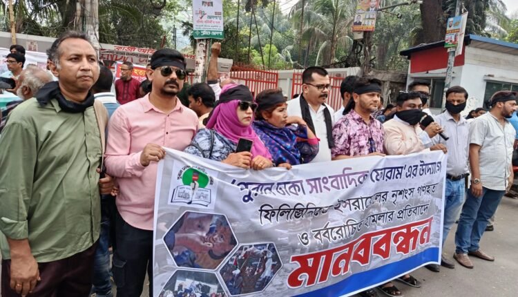 ফিলিস্তিনে গণহত্যার প্রতিবাদে জাতীয় প্রেসক্লাবের সামনে মানববন্ধন করে পূরাণ ঢাকা সাংবাদিক ফোরাম