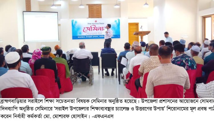 ব্রাহ্মণবাড়িয়ার সরাইলে শিক্ষা সচেতনতা বিষয়ক সেমিনার অনুষ্ঠিত হয়েছে। উপজেলা প্রশাসনের আয়োজনে সোমবার দিনব্যাপি অনুষ্ঠিত সেমিনারে ‘সরাইল উপজেলার শিক্ষাব্যবস্থার চ্যালেঞ্জ ও উত্তরণের উপায়’ শিরোনামের মূল প্রবন্ধ পাঠ করেন নির্বাহী কর্মকর্তা মো. মোশারফ হোসাইন।